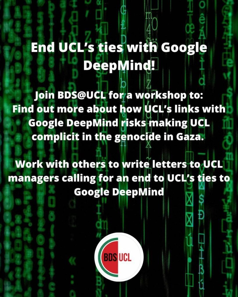 - Find out more about how UCL’s links with Google DeepMind risks making UCL complicit in the genocide in Gaza.